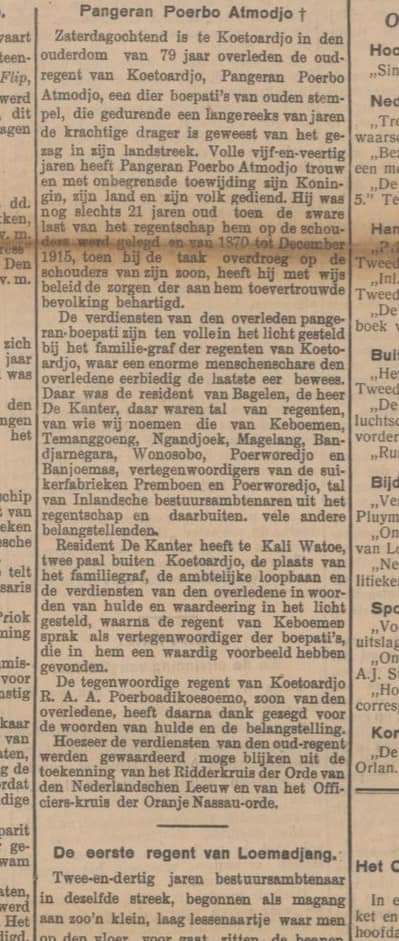 Koran Belanda HET VADERLAND Donderdag 12 November 1915 NO. 315 EERSTE AVONDBLAD B (Koran Belanda THE FATHERLAND Kamis, 12 November 1915 NO. 315 LEMBAR MALAM PERTAMA B)JUBILEUMMen schrijft Aan bet Soer . Hbl. :Te Koetoardjo bestast het voornemen tot feestelijke berdenking van het 45-jarig jubileun als regent Van Pangeran Purbo atmodjo op 19 Oktober a.s.De oude Pangeran, die op 19 Oct. 1870 tot regent Van Koetoardjo werd verheven, ziet er nog krachtig uit voor zijn leeftijd en heeft voorlo pig nog geen plan om af te treden, tenzij hij daartoe genoodznakt mocht worden vooral hij dat hij de zekerheid mist, dat zijn oudste zoon de Patih Soemadi (R. Poerbo Adiekoesomo) Van Wonosobo hem zal opvolgen.Terjemahan Bahasa Indonesia :